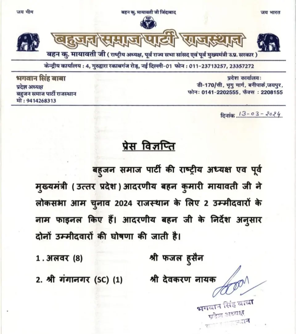 राजस्थान: लोकसभा चुनाव 2024 के लिए बसपा ने अपने उम्मीदवारों की घोषणा की, जानिए किन्हें किस सीट से उतारा