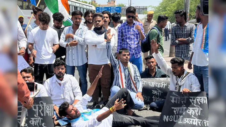 NEET exam: नेशनल टेस्टिंग एजेंसी (NTA) द्वारा हाल ही में जारी हुए NEET UG-2024 रिजल्ट में गड़बड़ी के आरोप लग रहे हैं. इस परीक्षा में पहली बार ऑल इंडिया फर्स्ट रैंक पर 67 स्टूडेंट रहे. आरोप है कि इनमें 16 स्टूडेंट्स के रोल नंबर आस-पास थे. नीट परीक्षा में हुई धांधली के खिलाफ शनिवार को अजमेर में कांग्रेस के छात्र संगठन एनएसयूआई के कार्यकर्ताओं ने जोरदार विरोध-प्रदर्शन किया. इस दौरान पुलिस से झड़प भी हुई. हाथापाई के बाद एक छात्र नेता को हिरासत में लिया गया.  मालूम हो कि नीट परीक्षा के हरियाणा, यूपी, गुजरात, राजस्थान, दिल्ली और कर्नाटक के टॉपर्स के मामले में ये गड़बड़ी सामने आई. हाल ये है कि हरियाणा के एक ही एग्जाम सेंटर के स्टूडेंट्स ने टॉप किया है. वहीं बिहार में पेपर लीक होने के आरोप लगे हैं. शनिवार को नीट रिजल्ट में भयंकर धांधली के आरोप एनएसयूआई प्रदेश अध्यक्ष विनोद जाखड़ के आह्वान पर छात्र नेता अंकित घारू के नेतृत्व में सम्राट पृथ्वीराज चौहान राजकीय महाविद्यालय अजमेर के मुख्य द्वार पर  ब्यावर रोड जाम करके केन्द्र सरकार और एनटीए के विरोध में जोरदार प्रदर्शन किया गया. रोड जाम होने के दौरान रोड के दोनों तरफ वाहनों का लंबा जाम लग गया उसके बाद पुलिस ने छात्र नेताओं के साथ धक्का मुक्की करते हुए छात्रनेता अंकित घारू को पुलिस ने हिरासत में लिया. हालांकि कुछ समय बाद जब धरना समाप्त होने पर अंकित घारू को छोड़ दिया गया.