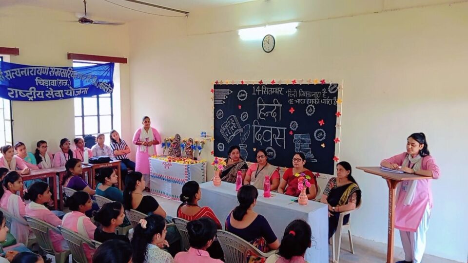 चिड़ावा। गिन्नी देवी सत्यनारायण सेखसरिया गर्ल्स पी.जी कॉलेज में राष्ट्रीय सेवा योजना एवं हिंदी विभाग के संयुक्त तत्वाधान में हिंदी सप्ताह का शुभारंभ देव प्रतिमा के समक्ष द्वीप प्रज्वलित कर किया गया। महाविद्यालय प्राचार्य डॉ. सुनीता शर्मा ने छात्राओं को हिंदी भाषा की दशा और दिशा पर उद्बोधन दिया। हिंदी विभागाध्यक्ष डॉ. सीमा सहल ने हिंदी सप्ताह में आयोजित होने वाले कार्यक्रमों की रूपरेखा प्रस्तुत की जिसमें चार्ट, स्लोगन निबंध गायन, काव्यपाठ, आशुभाषण आदि का आयोजन किया जाएगा।