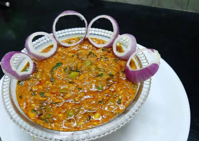पैन में थोड़ा सा घी डालिये. इसमें हींग, जीरा डाल दीजिए. जीरा तड़कने के बाद, दरदरा कुटा गरम मसाला, धनिया पाउडर, सोंफ पाउडर और टमाटर का पेस्ट डालिये और मसाले के ऊपर घी तैरने तक भून लीजिये.  भुने मसाले में दही डालिये और चलाते हुये दही में उबाल आने तक पकाइये. उबलते दही में कटे टमाटर, तली हुई हल्दी और भुनी मटर डालिये और चमचे से चलाते हुये उबाल आने तक पकाइये. नमक डाल दीजिये और सब्जी को 2-3 मिनिट उबलने दीजिये.